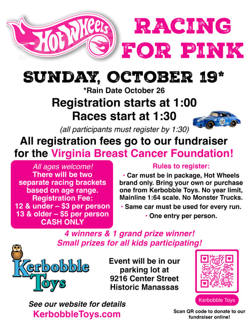 Join us Sunday, October 19 for a fun filled day of hot wheels racing! Registration fees go to our fundraister for the Virginia Breast Cancer Foundation! See details in flyer.